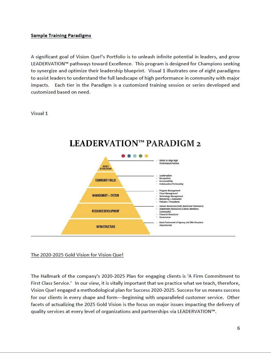 Why Contract with Vision Que!™? Its high performance standard is operationalized as a guiding principle for the company, and evidenced in each facet of project delivery. Services are cutting-edge—an innovative combination of traditional and nontraditional methodologies, and most importantly, expedient. The company is fully equipped to provide state-of-the art services, with guidance and personal attention on a broad range of services. Particularly the Vision Que!™ team has developed a niche in training and direct technical assistance with significant outcomes achieved in over 1000 training and capacity building assistance (CBA) sessions delivered throughout the United States.